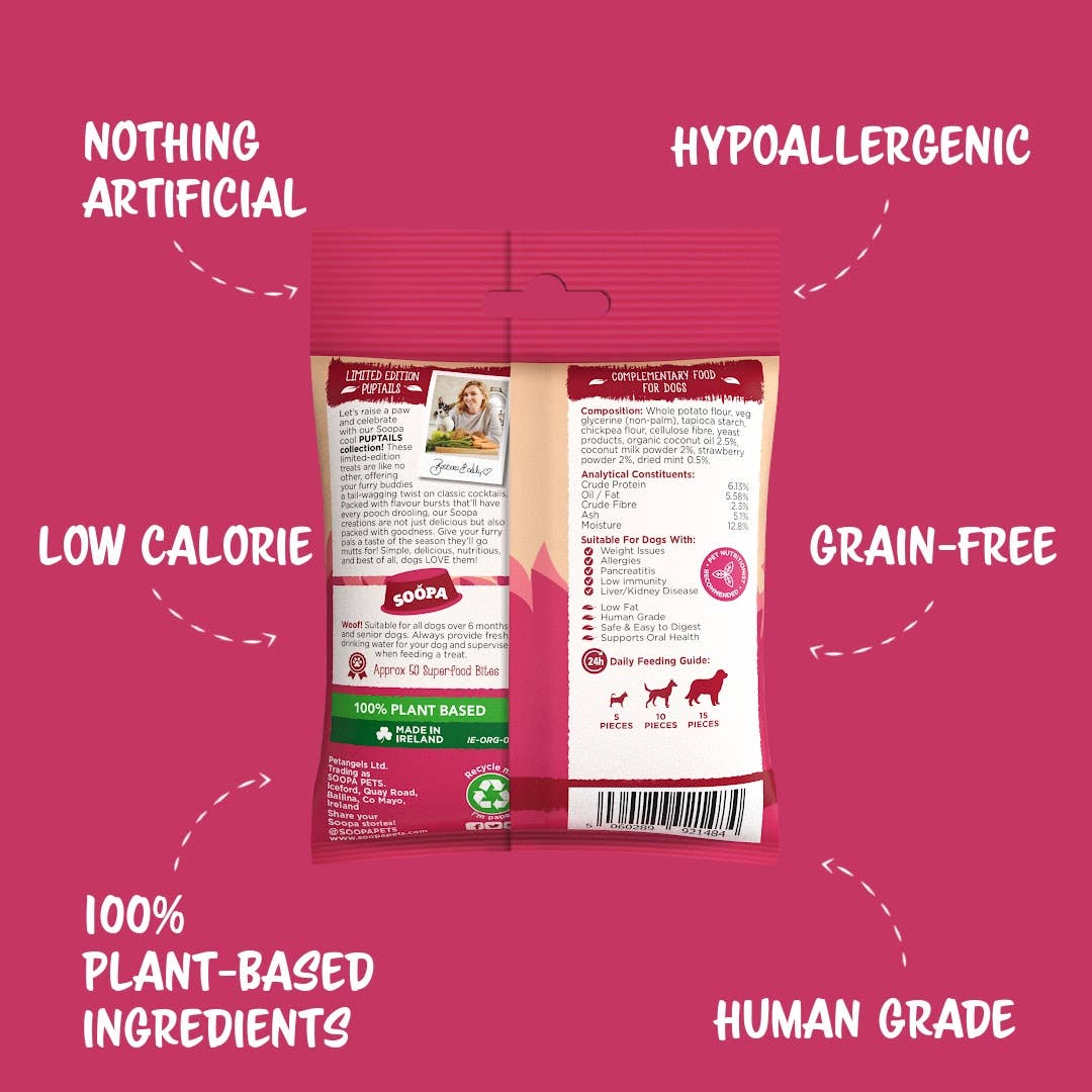 Vous recherchez une délicieuse friandise pour chien qui soit également saine ? Levons la patte et célébrons avec notre collection cool PUPTAILS de Soopa ! Ces friandises en édition limitée ne ressemblent à aucune autre et offrent à vos amis à quatre pattes une touche originale aux cocktails classiques. Débordant de saveurs qui feront baver tous les chiens, donnez à vos amis à quatre pattes un avant-goût de la saison pour laquelle ils adoreront les chiens ! Le saviez-vous ? La noix de coco contient des propriétés anti-inflammatoires qui peuvent améliorer la guérison, réduire l'enflure et aider à soulager les douleurs articulaires. Les noix de coco favorisent une peau saine et un pelage brillant, et les antioxydants peuvent atténuer les démangeaisons de la peau sèche. Poids 63g