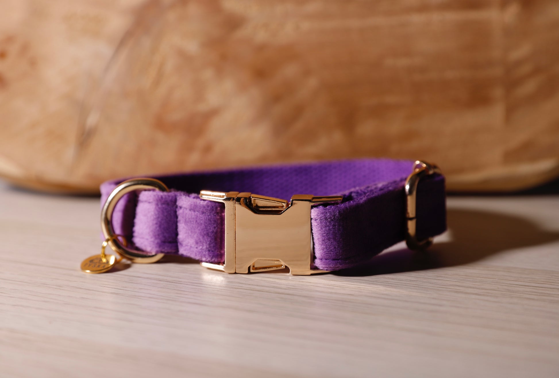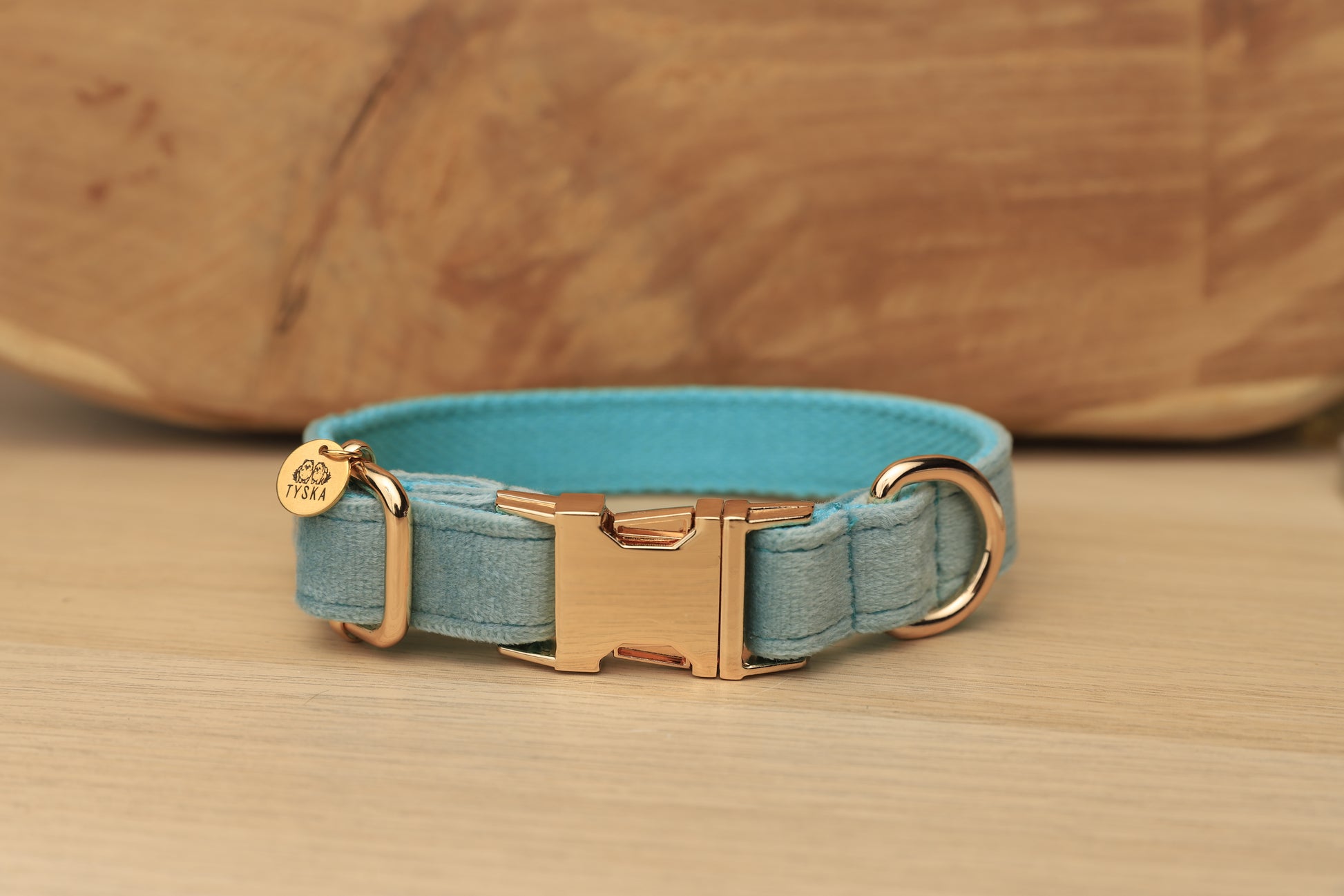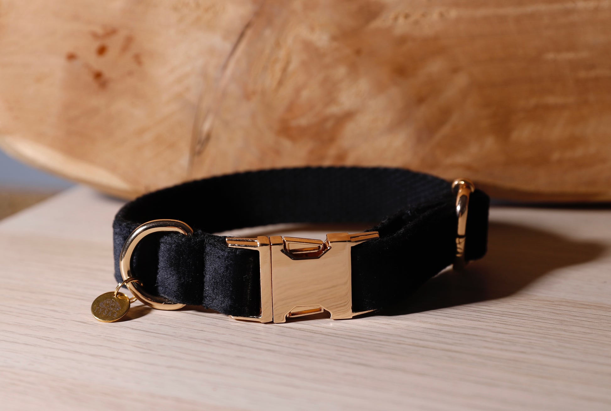 Collier en velours avec bouclerie en acier doré clair.