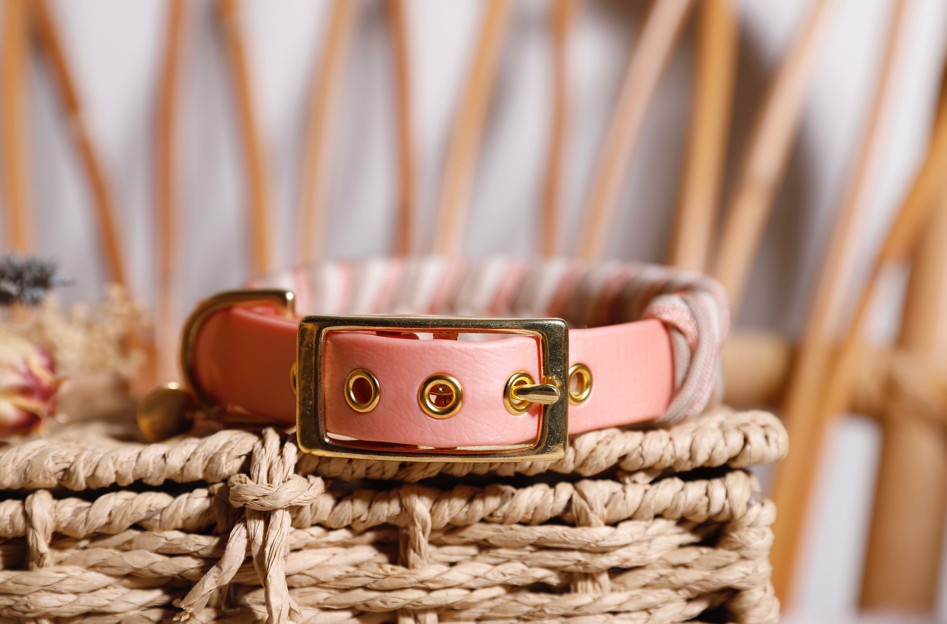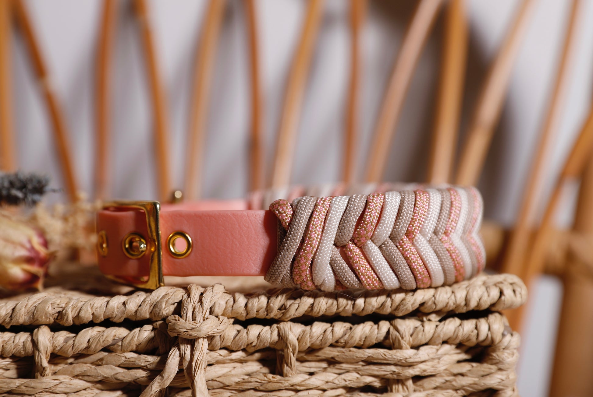 Ce collier de chez TYSKA en biothane et en paracorde tressé. Les boucles sont en laiton massif, matériau qui résiste à l'eau de mer. Ne rouille pas.