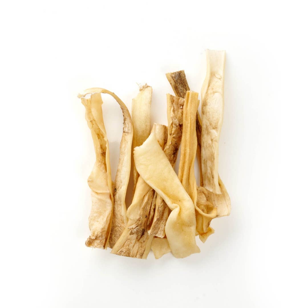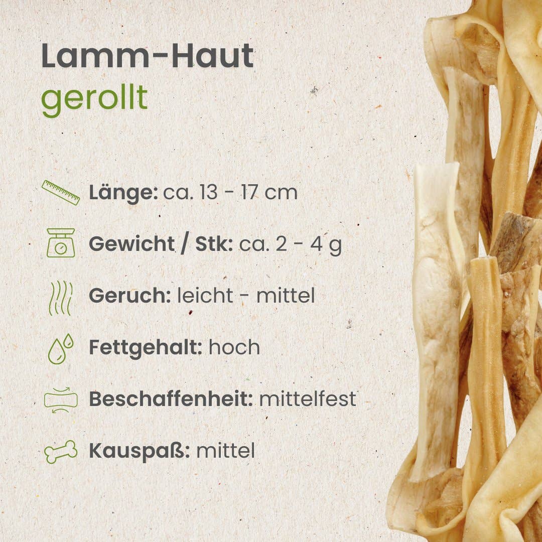sans conservateurs La peau d'agneau roulée est une friandise naturelle à mâcher faite de peau de tête d'agneau séchée. Grâce à sa forme compacte, mâcher devient un petit défi, ce qui non seulement occupe le chien, mais nettoie également ses dents. Parce que la peau d'agneau roulée ne contient qu'une seule source de protéines, elle convient également aux chiens sensibles ou en cas d'intolérances alimentaires. La friandise a peu d'odeur et peut être donnée entre les repas - pour mâcher, jouer ou simplement comme petite récompense. Description : Longueur : env. 13-17 cm Poids (par pièce) : env. 2-4 g Odeur : légère à moyenne Teneur en graisse : élevée Consistance : mi-ferme Plaisir de mâcher : moyen Composition : 100% peau de tête d'agneau Constituants analytiques : Protéines brutes : 67,4% Matières grasses brutes : 24,7% Humidité : 3,5% Cendres brutes : 4,4%