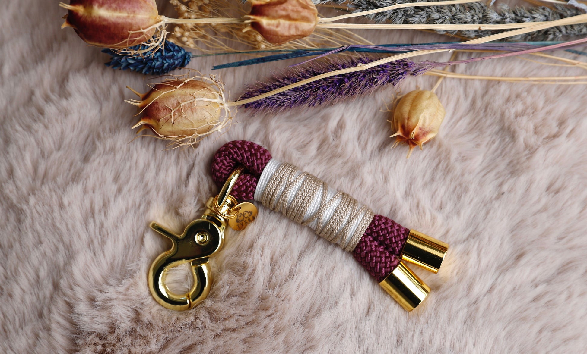 Porte-clé en corde. Différentes couleurs sont disponibles. Entretien : Le lavage à la main est fortement recommandé. Pas de sèche-linge.