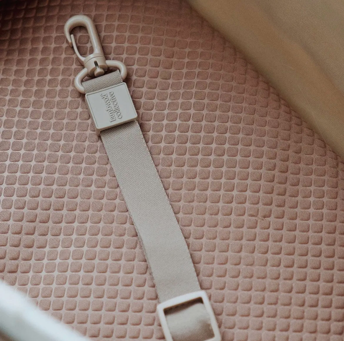 Une ceinture de sécurité réglable est incluse pour attacher le support au collier/harnais. La fermeture zippée repose facilement sur les côtés intérieurs lorsqu'elle n'est pas utilisée. Le porte-bébé est doublé pour un entretien facile.
